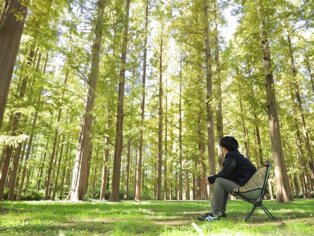 光の色がまるで外国。メタセコイヤの並木に椅子を置くだけで、心がゆるむんだよね。